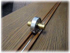 | 特殊ベアリングは一個が465kg耐荷重に対応し、公的機関の磨耗試験でも半永久的な耐久性が証明されいつまでも錆びません。 | 通常は2本の平行する後ろ側にスライド・ボックスをセットしますが、手前側のレールにスライドボックスをセットすれば、後列の棚の奥行きが拡大されたことになり、棚からはみ出した部分があたることなく一回り大きな本でもらくらく収納することが出来ます。 |